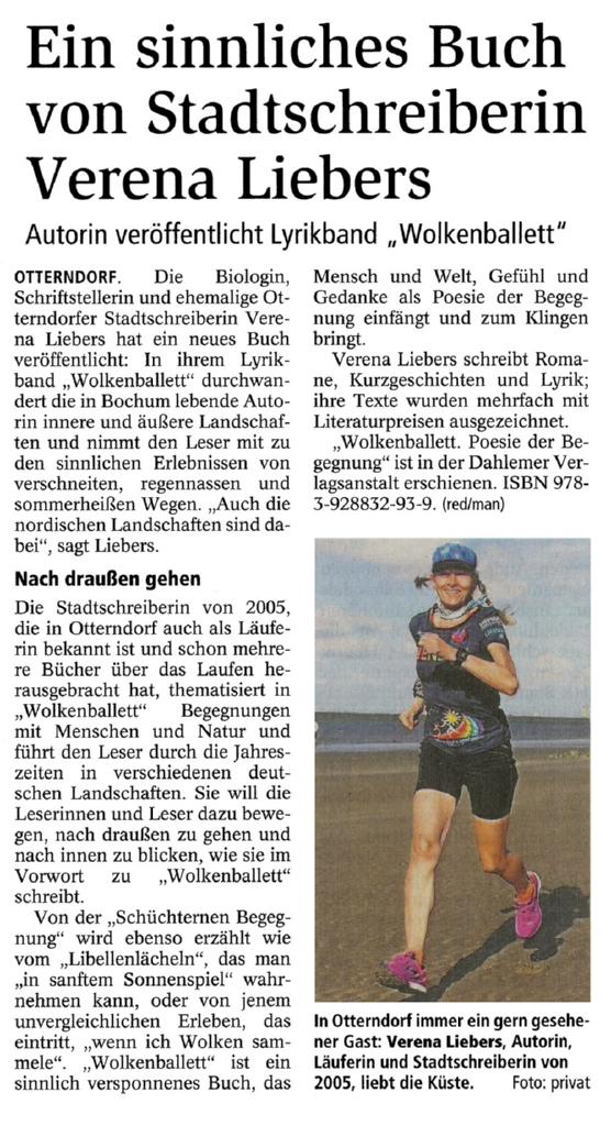 Liebers, die ihre Passion für das Laufen in dem Buch »Vom Abenteuer 100 km zu laufen« verarbeitet hat, gelingt es in ihren Gedichten, scheinbar Alltäglichem neue Seiten abzugewinnen. So findet sich im Kapitel »Als der Sommer sonnig war« das Gedicht »Ich biege den Kopf in den Nacken«, das eindrucksvoll das Spiel zwischen Sonne und Wolken beschreibt: Unterstreichen zunächst Schönwetterwolken die Schönheit des Tages, setzt sich dann der Regen durch und verstellt den Blick auf die Farbenpracht der Natur. Der Regen steht für den Rückzug der Menschen in sich selbst. So ist das Gedicht ein Appell, öfter den Kopf in den Nacken zu biegen und sich für die Schönheit der Natur zu öffnen.